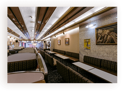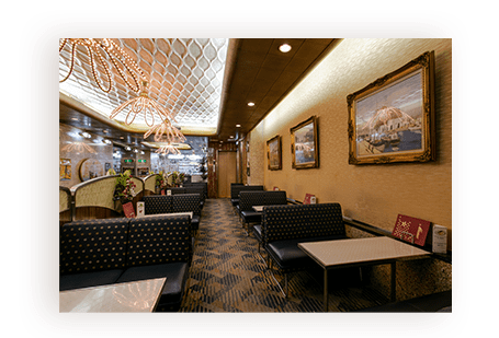 なんば駅から徒歩4分、千日前商店街に位置し、豪華なシャンデリアや昭和レトロな内装が魅力です。